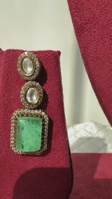 This striking necklace set features bold rectangular green stones paired with shimmering oval crystal motifs. The standout pendant shows mosaic-style arrangement of green stones framed with intricate gold-toned detailing and moissanite borders. Matching earrings complete the set.