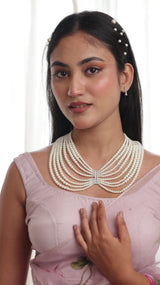 Design Style: Choker-Collar Design with the use of layered pearls with a central cubic zirconia clasp.