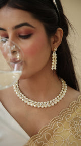 Step into timeless sophistication with this pearl-adorned jewelry set. Featuring a double-layer pearl necklace, elegant drop earrings, each piece is designed to bring out your inner radiance. The lustrous pearls are paired with subtle gold detailing, striking the perfect balance between tradition and modern minimalism.