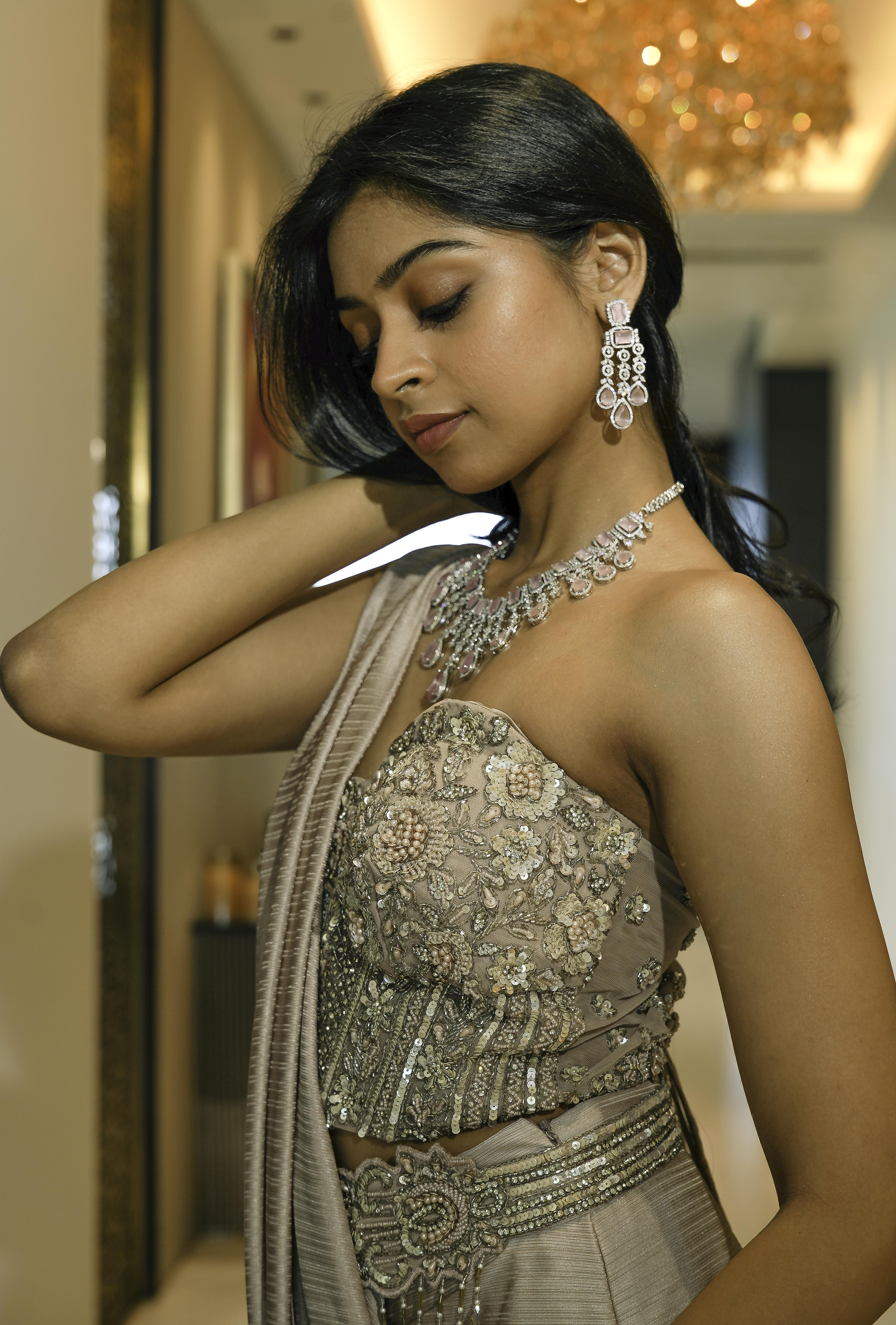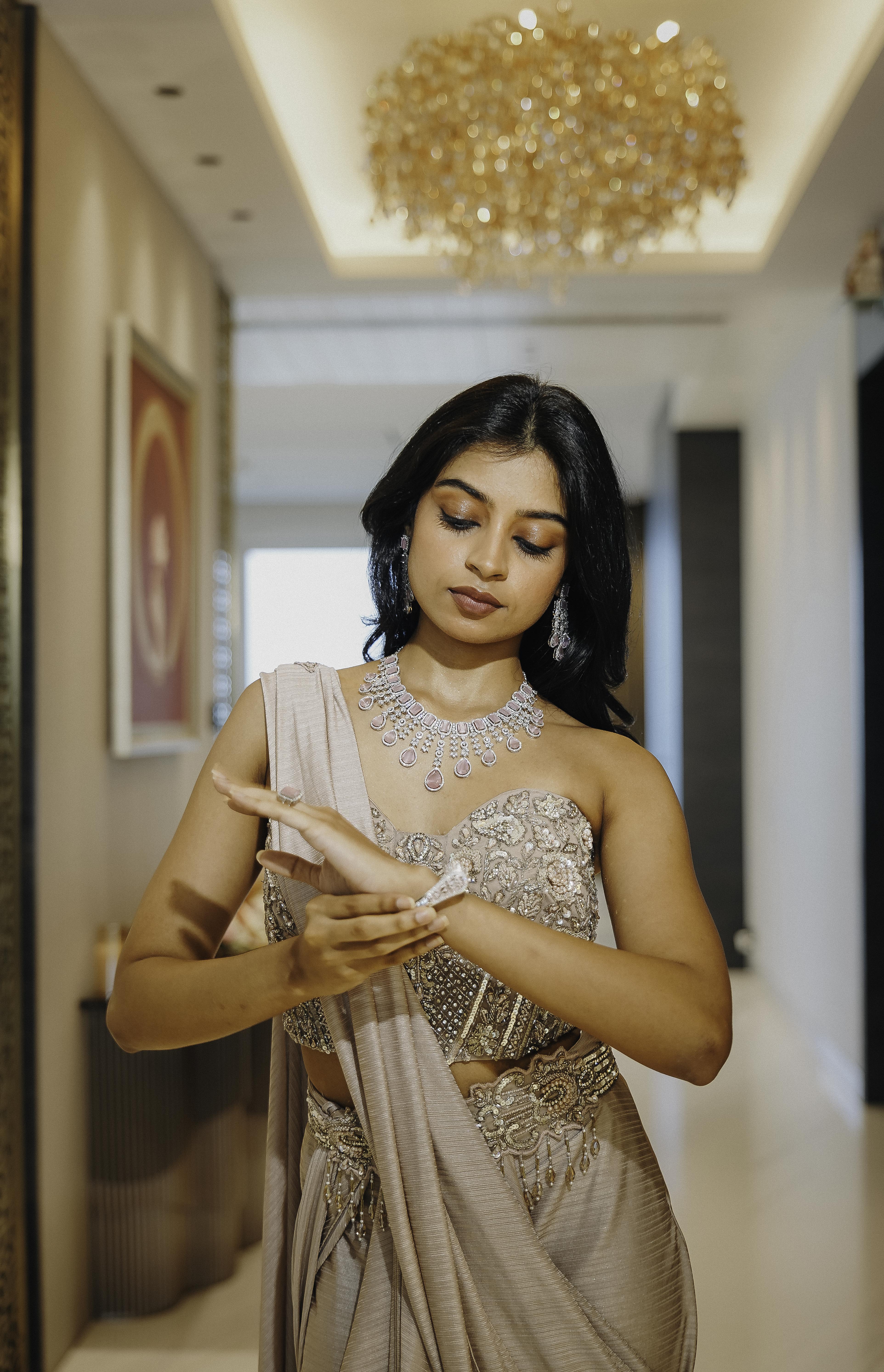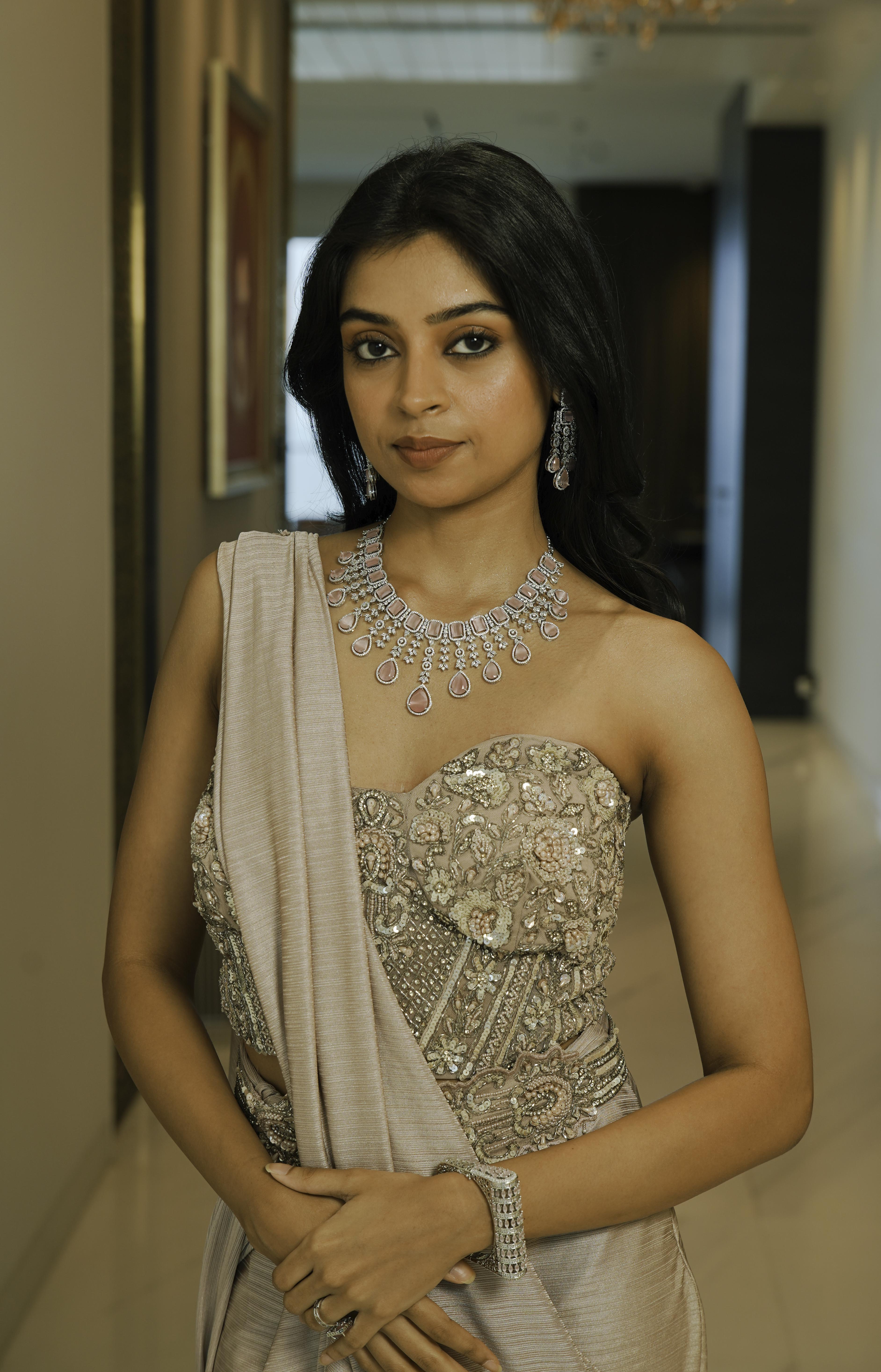 Pair Roselle Drop with a rose-toned saree, a muted mauve lehenga, or even a ruffled gown.