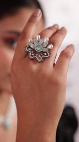 Inspired by the elegance of a lotus in full bloom, this striking statement ring is a true work of art. At its heart lies a smooth russian green emerald stone, radiating serenity and balance. Surrounding it are layers of pavé-set cubic zirconia diamonds, forming shimmering petals that enhance its floral brilliance.