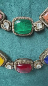 This magnificent set features two graceful strands composed of large, linked, cushion-cut or rectangular stones in a dazzling spectrum of colors. Each vibrant semi-precious gem including lush greens, deep reds, sunny yellows, and royal blues - giving the piece a rich, textural contrast.